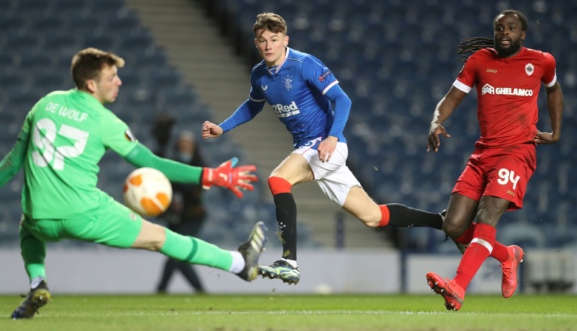 Le défenseur des Glagow Rangers, Nathan Patterson, trompe le gardien de but d'Anvers, Ortwin De Wolf, lors du 16e de finale retour de la Ligue Europa, le 25 février 2021 à Glasgow RUSSELL CHEYNE [POOL/AFP]MERCI DE VOUS IDENTIFIER