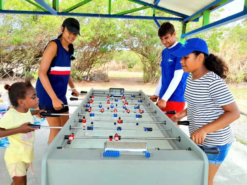Enfants et adolescents jouent ensemble, comme ici autour du baby-foot. Photo Anthony Tejero"L’objectif, c’est d’occuper au mieux les jeunes pendant cette période de vacances d’été, notamment ceux dont les familles n’ont pas les moyens de partir en vacances, glisse Téva Legras, éducateur sportif et coordinateur de l’événement. Nous mettons à disposition des bus gratuits pour les habitants de la commune car tout le monde n’a pas accès à la plage. Et beaucoup de familles ne pourraient pas offrir à leurs enfants les activités que nous leur proposons sur le site."