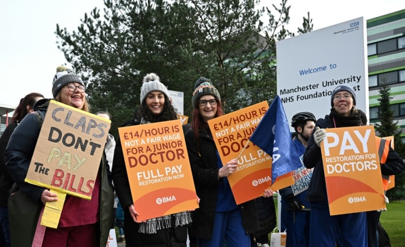 Lors d'une manifestation de jeunes médecins devan un hôpital à Manchester, le 15 mars 2023 Paul ELLIS [AFP]MERCI DE VOUS IDENTIFIER