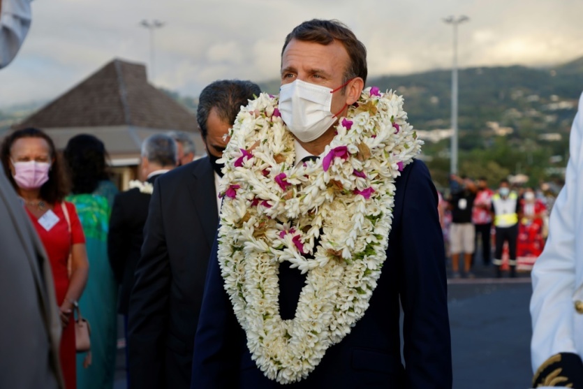 Le président Emmanuel Macron accueilli à son arrivée à Papeete, sur l'île de Tahiti, le 24 juillet 2021 Ludovic MARIN [AFP]MERCI DE VOUS IDENTIFIER