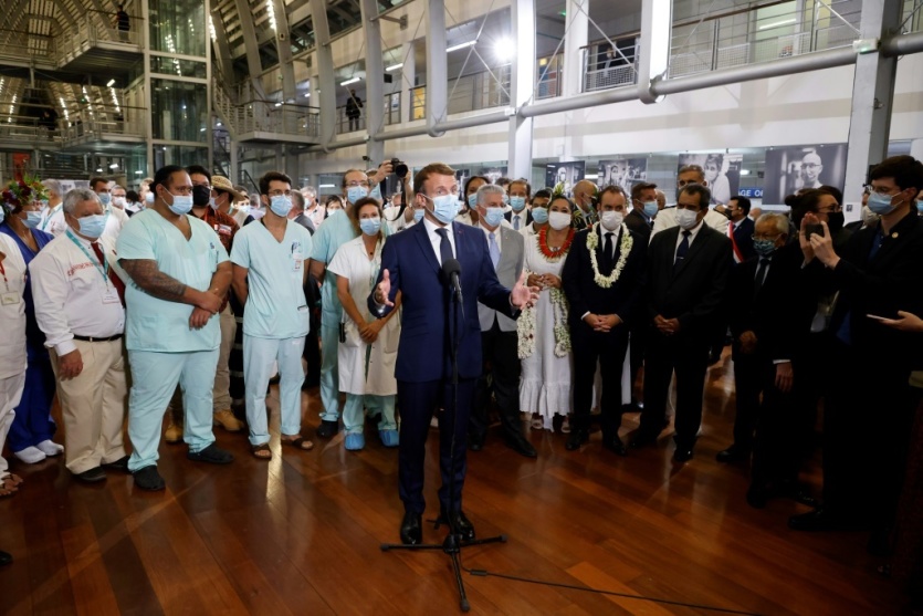 "Je veux lancer un message très fort pour appeler chacune et chacun à se faire vacciner parce qu'on le voit sous toutes les latitudes: quand on est vacciné, on est protégé et on ne diffuse quasiment plus, en tout cas beaucoup moins, le virus", a déclaré le chef de l'Etat face aux soignants du Centre Hospitalier de la Polynésie française.