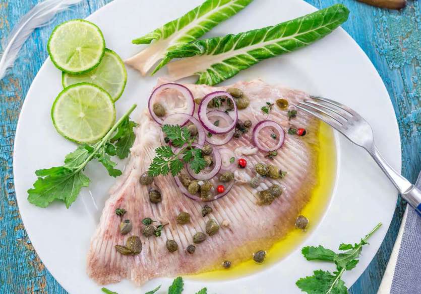 3. Couvrez le fond du panier d’un autocuiseur d’herbes, déposez les ailes de raies dessus, salez et poivrez.