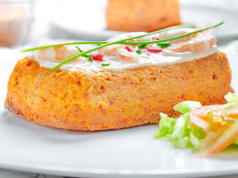 4. Versez un peu de crème fraîche sur votre cake et décorez avec des crevettes et de la ciboulette.