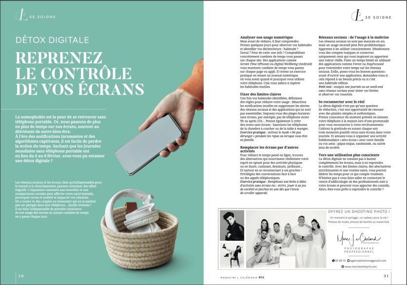 - L Calédonie | Crée le 13.04.2025 à 09h00 | Mis à jour le 13.04.2025 à 09h00ImprimerLa nomophobie est la peur de se retrouver sans téléphone portable. Or, nous passons de plus en plus de temps sur nos écrans, souvent au détriment de notre bien-être. À l'ère des notifications incessantes et des algorithmes captivants, il est facile de perdre la notion du temps. Sachant que les Journées mondiales sans téléphone portable ont eu lieu du 6 au 8 février, avez-vous pu entamer une détox digitale ? Un article rédigé par notre partenaire le magazine L Calédonie, paru en mars 2025.