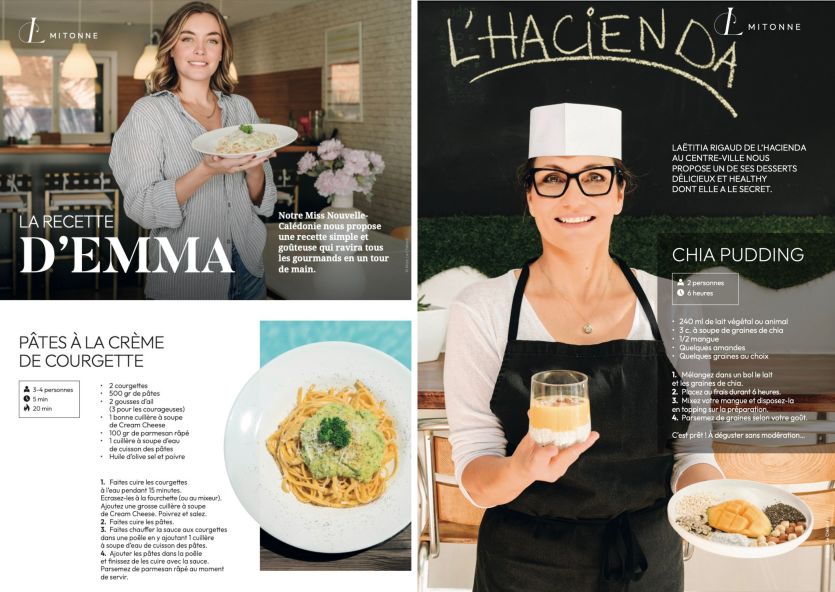 - L Calédonie magazine | Crée le 26.01.2025 à 10h00 | Mis à jour le 26.01.2025 à 10h00ImprimerLes recettes simples et délicieuses d'Emma, Miss Nouvelle-Calédonie, et de Laëtitia, de l'Hacienda. Photo Marc Le Chelard / L CalédonieL Calédonie, le magazine féminin 100 % calédonien, a rencontré Emma, Miss Nouvelle-Calédonie et Laëtitia Rigaud, du snack l'Hacienda, qui nous livrent deux recettes simples et healthy pour se faire plaisir rapidement.