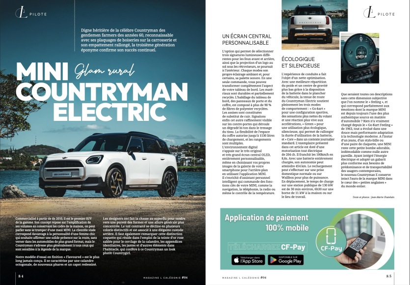 - Texte et photos : Jean-Marie Chatelain /L Calédonie | Crée le 01.06.2025 à 06h00 | Mis à jour le 02.06.2025 à 13h36ImprimerPhoto Jean-Marie ChatelainCommercialisé à partir de de 2010, il est le premier SUV de la gamme. Son concept repose sur l'amplification de ses volumes en conservant les codes de la maison, on peut parler sans se tromper d'une maxi MINI. Le Countryman s'adresse à tous ceux qui sont sensibles à la légende de la marque. Un article de notre partenaire le magazine L Calédonie, paru en mars.