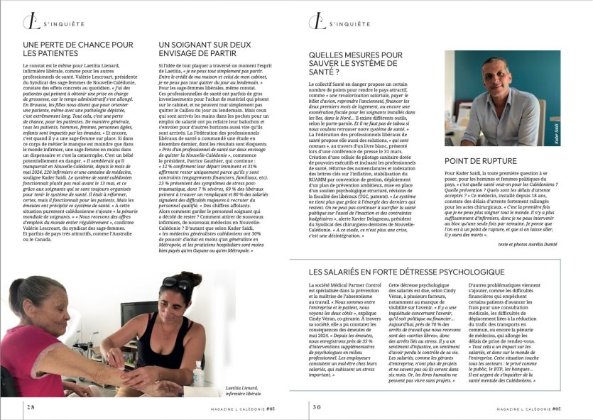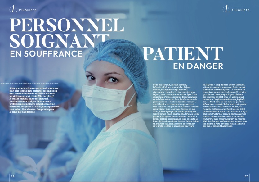 - Aurélia Dumté - L Calédonie | Crée le 15.06.2025 à 06h00 | Mis à jour le 15.06.2025 à 06h00ImprimerRéjane et Laetitia, infirmière. Laetitia passe deux fois par jour chez Réjane. Photo Aurélia DumtéAlors que la situation des personnels médicaux était déjà tendue dans certaines spécialités ou dans certaines zones de Nouvelle-Calédonie, les violences de mai et juin 2024 ont plongé le monde médical dans une situation particulièrement critique. De nombreux professionnels, médecins spécialisés comme infirmiers, ont quitté le Caillou, des dispensaires sont vides… Une situation dangereuse pour la santé des Calédoniens. Un dossier proposé par notre partenaire le magazine L Calédonie, paru en mai 2025.