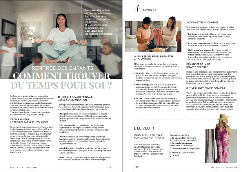 - L Calédonie | Crée le 16.03.2025 à 09h00 | Mis à jour le 16.03.2025 à 09h00ImprimerTrouver du temps pour soi au moment de la rentrée scolaire. L CaledonieLa rentrée des enfants est une période intense. Entre l'organisation des activités scolaires, les devoirs et les responsabilités professionnelles, il est facile pour les mamans de s'oublier… Le point avec notre partenaire le magazine L Calédonie, paru en mars 2025.