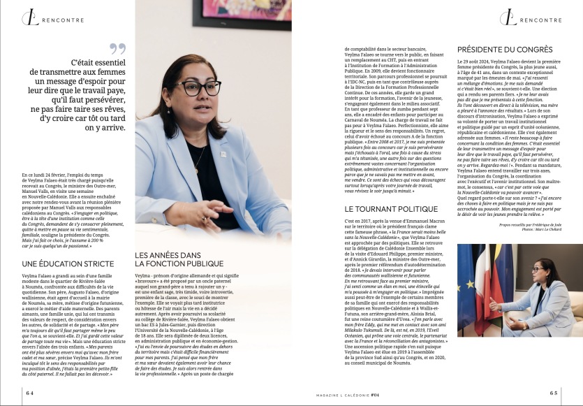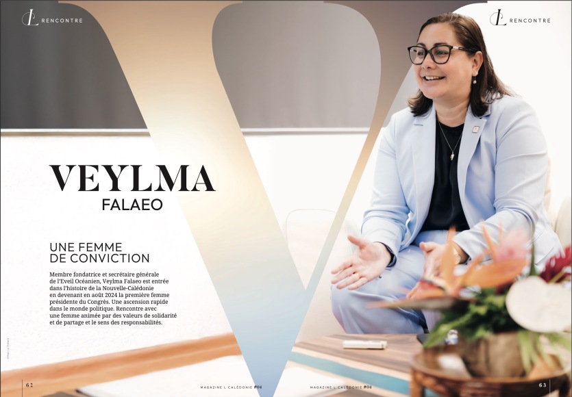 - Propos recueillis par Frédérique de Jode Photos : Marc Le Chélard L Calédonie | Crée le 30.03.2025 à 09h00 | Mis à jour le 30.03.2025 à 09h01ImprimerPhoto Marc Le Chelard/L CalédonieMembre fondatrice et secrétaire générale de l'Eveil Océanien, Veylma Falaeo est entrée dans l'histoire de la Nouvelle-Calédonie en devenant en août 2024 la première femme présidente du Congrès. Une ascension rapide dans le monde politique. Rencontre avec une femme animée par des valeurs de solidarité et de partage et le sens des responsabilités. Un portrait réalisé par notre partenaire le magazine L Calédonie, paru en mars 2025.
