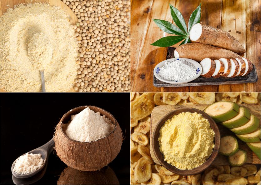 De gauche à droite, farine d’ambrevade, de manioc, de coco et de banane verte, autant de farines qu’il est possible de produire localement. Photo DRUne farine de blé 100 % locale ?