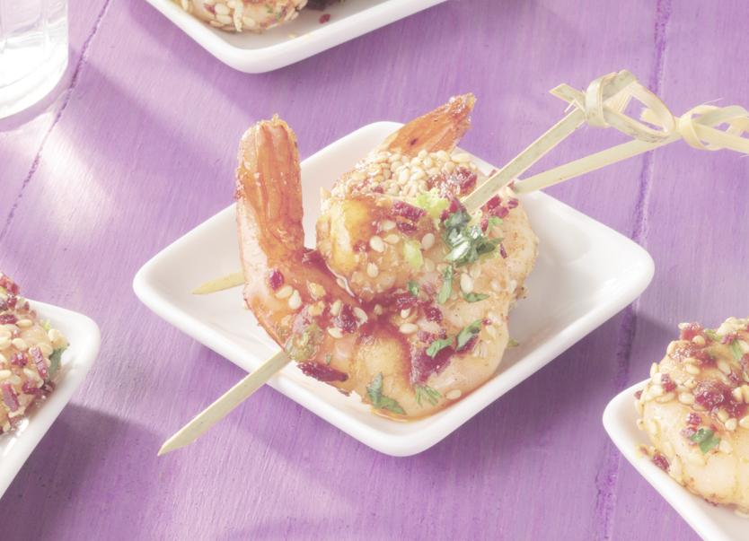 Le n°4 du magazine Graines de saveurs est paru en décembre 2024. Retrouvez dans ses pages de nombreuses recettes et des articles sur la cuisine. Photo GDSEn entrée : bouchées de crevettes au magret de canard fumé et Tabasco®