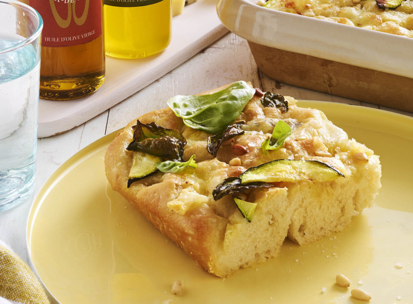Focaccia à la courgette.Préparation : 20 minutes ; pause : 2 heures; cuisson : 30 minutes ; 4 personnes