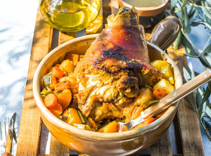 En plat principal : Jarret de porc aux légumes et pommes de terre à l'huile d'olive