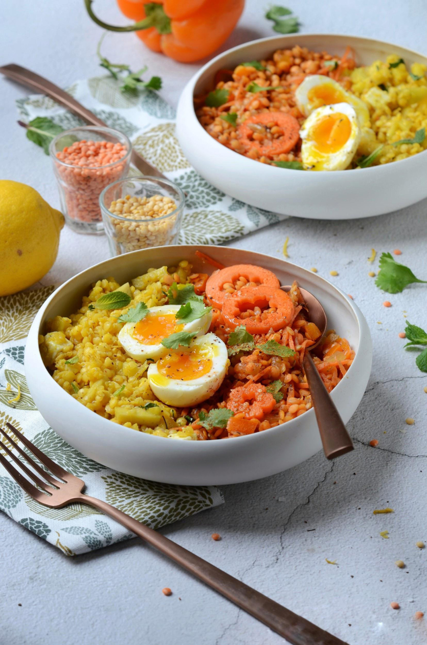 2. Pour la salade orange, grillez l'oignon coupé dans 1 c. à soupe d'huile pendant 1 min. Ajoutez le poivron en dés et continuez la cuisson 5 min, avant de réserver hors du feu. Râpez la carotte puis mélangez tous les ingrédients préparés avec les lentilles corail. Salez, poivrez et réservez au frais.