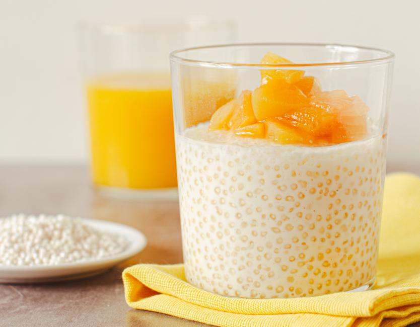 Perles de tapioca à la mangue et au lait de coco.Préparation : 10 minutes ; cuisson : 45 minutes ; réfrigération : 2 heures ; 6 personnes ; difficulté : facile