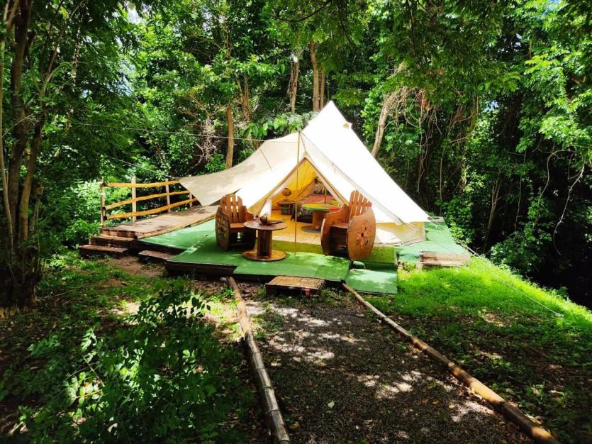 Dans le camping Ecolibry, situé au Morne-Vert, tout est fait pour passer un séjour écoresponsable : nuit en tente au milieu des arbres, douche économe en énergie, repas en circuit court, assiettes en calebasses, activités écovolontaires. La créatrice du lieu, Aline Charles-Alfred, prône un tourisme durable avec ce concept de " glamping " (mélange de camping et de glamour).