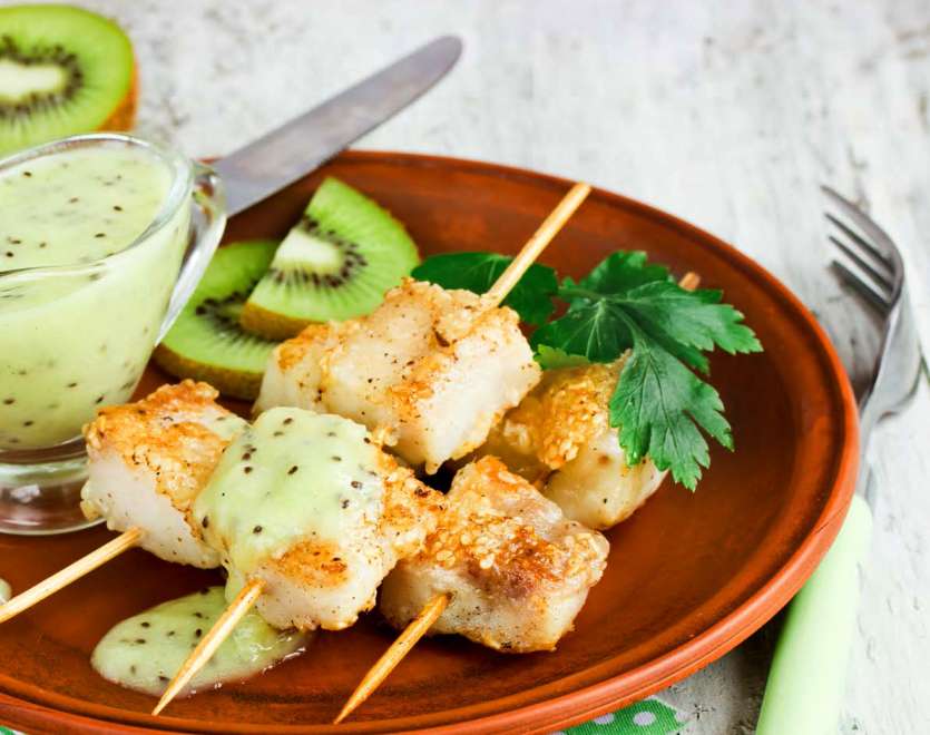 1. Découpez le poisson en gros morceaux. Enfilez deux morceaux sur chaque pic à brochette. Badigeonnez le poisson d’huile de sésame et saupoudrez légèrement de graines de sésame. Mettez vos brochettes à cuire au barbecue ou à la poêle quelques minutes.