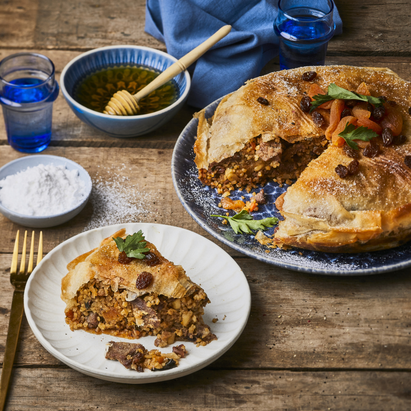 Pastilla d'agneau au boulgour, raisins secs et miel