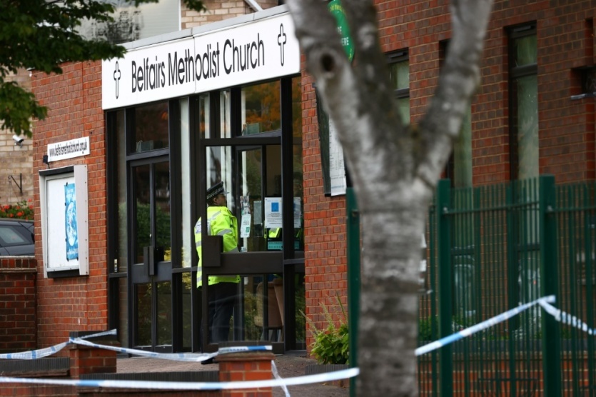 Des policiers le 17 octobre 2021 sur le lieu où le député britannique David Amess a été poignardé à mort à l'égliste méthodiste Belfairs de Leigh-on-Sea Adrian DENNIS [AFP]MERCI DE VOUS IDENTIFIER