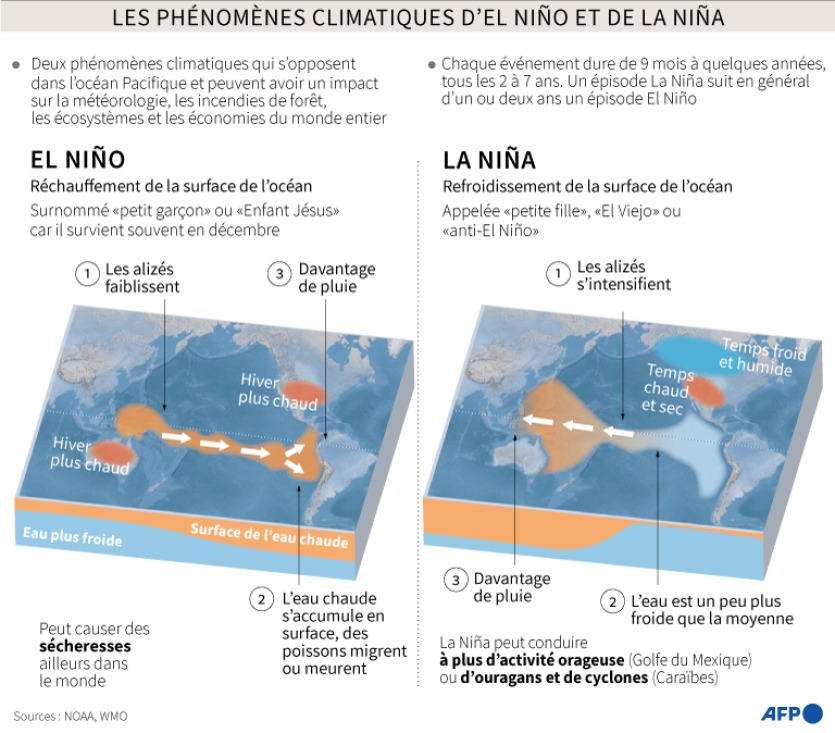 Infographie AFPLe changement climatique influence le cycle Enso, mais son effet reste encore flou, explique Michelle L’Heureux, spécialiste du phénomène à l’agence météorologique américaine NOAA. Les conditions plus sèches ou plus humides provoquées par l’Enso "peuvent s’amplifier" à cause du réchauffement mondial, selon elle.