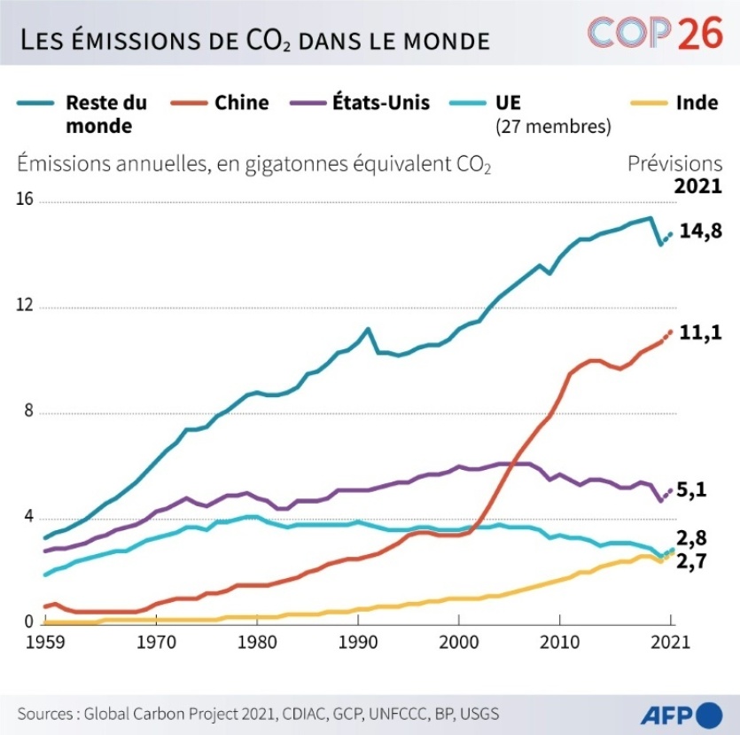 - | Crée le 04.11.2021 à 02h16 | Mis à jour le 04.11.2021 à 12h17ImprimerUne centrale à charbon à Datong, dans la province chinoise du Shanxi, le 3 novembre 2021 Noel Celis [AFP]La crise du Covid n'aura été qu'une parenthèse pour le climat et les émissions mondiales de CO2, principal gaz à effet de serre, sont reparties de plus belle, laissant de moins en moins de temps pour contrer le réchauffement climatique, alerte une étude jeudi.