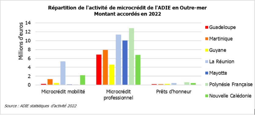 Répartition des activités de microcrédits de l’Adie dans les territoires ultramarins. Graphique : AdieLe microcrédit connaît un succès important en Outre-mer comme en témoigne l’évolution de l’activité de l’Adie, le plus gros opérateur, qui a multiplié par plus de cinq ses montants octroyés sur ces géographies sur dix ans : de 13,1 millions d’euros en 2012 à 72,5 millions d’euros en 2022. Si cette hausse est constatée dans toutes les géographies ultramarines, La Réunion et la Polynésie française concentrent à elles deux 43 % des montants accordés en 2022.