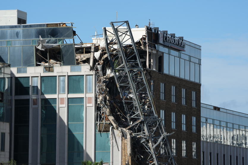 Une grue s'est effondrée sur un immeuble au centre ville de Petersburg, en Floride, après le passage de l'ouragan Milton. AFP / BRYAN R. SMITHJoe Biden a cependant appelé sur X la population à "rester à l'intérieur" pour le moment, notamment pour éviter "les lignes électriques à terre, les débris, et les routes emportées".