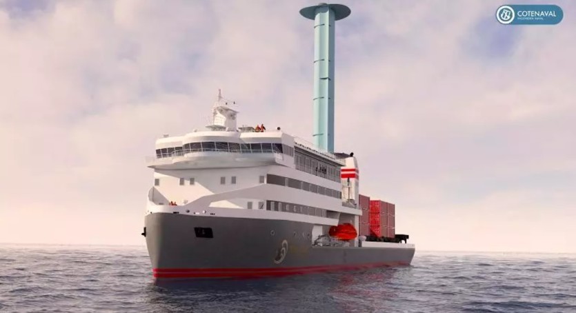 Le Na Hiro e Pae pourra ainsi compter sur une source d'énergie renouvelable : le vent. La tour de 22 mètres de haut qui sera installée au centre du navire n'a en effet rien d'une cheminée mais tout d'un mât : cette turbovoile, un tube creux et effilé, qui, correctement orienté, permet de réduire sensiblement la consommation de carburant. Objectif : 10% d'économie de gazole dans un premier temps, là où la moyenne mesurée pour ce genre de technologie est de 13% et que certains essais ont abouti à une économie de plus de 20% sur la consommation.