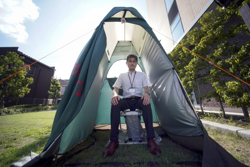 Les installations du centre d’évacuation du quartier d’Arakawa ont parfois un côté insolite à l’image de ces toilettes temporaires posées au milieu d’un petit parc. Photo Kazuhiro NOGI / AFPBeaucoup d’habitants âgés