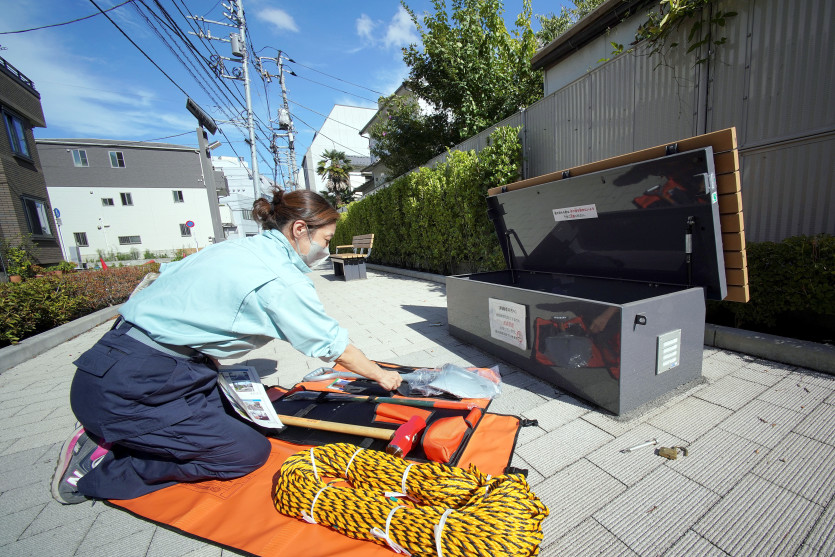 Une femme vérifie les équipements d’urgence de prévention des catastrophes installés sur un banc sur le trottoir du quartier d’Arakawa. Photo Kazuhiro NOGI / AFPA un endroit, la mairie a acheté les terrains après la destruction de vieilles maisons pour élargir la rue et en faire un petit square. Mais derrière leur apparence banale, les deux bancs publics installés sur la placette doivent aussi servir en cas de désastre : l’un est convertible en table de cuisson au feu de bois, et le socle du second contient des outils d’urgence : pelle, masse, scie, pied-de-biche, corde…