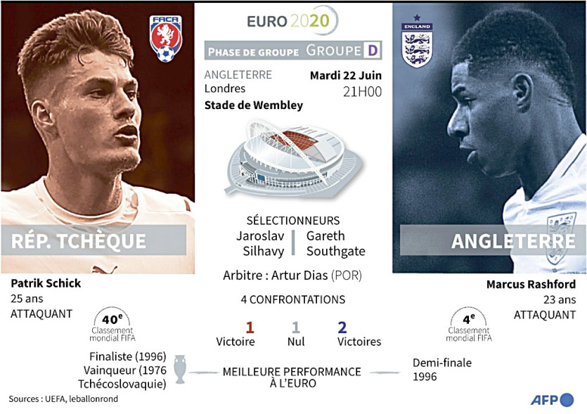 Sans jouer, Anglais et Tchèques - comme la France - ont décroché leur billet pour les huitièmes dès lundi soir. Leur duel en soirée à Wembley a donc perdu un peu de sa tension alors que les deux équipes sont assurées de passer avec les 4 points déjà engrangés, avec une différence de buts favorable à Patrik Schick et ses partenaires (+2 contre +1).