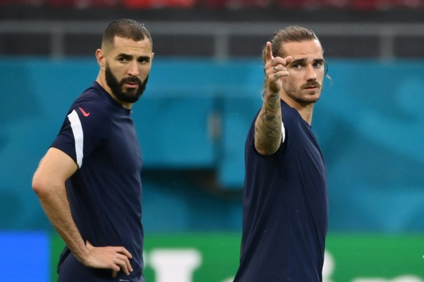 Karim Benzema et Antoine Griezmann à l'entraînement de l'équipe de France le 27 juin 2021 à Bucarest