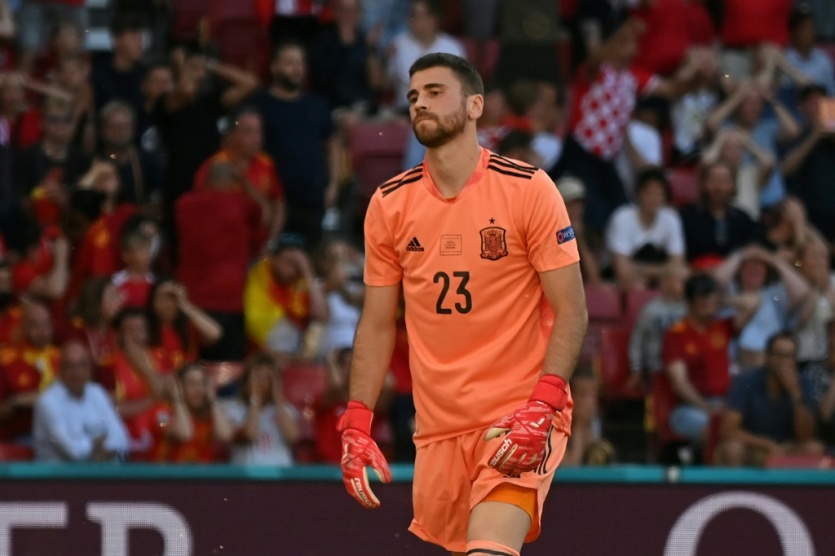 Le gardien de but espagnol Unai Simon, après avoir manqué le ballon et marqué contre son camp face à la Croatie, lors de leur 8e de finale à l'Euro 2020, le 28 juin 2021 à Copenhague
