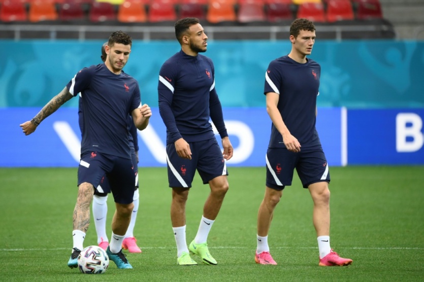 Lucas Hernandez (à gauche) à l'entraînement de l'équipe de France avec Corentin Tolisso et Benjamin Pavard le 27 juin 2021 à Bucarest