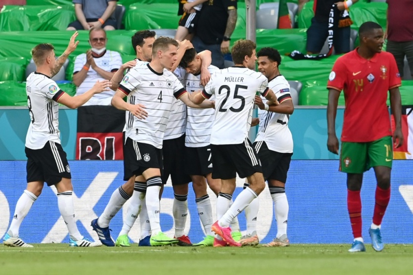 Les Allemands célèbrent leur troisième but marqué contre le Portugal à l'Euro, le 19 juin 2021 à Munich