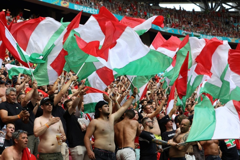 Des supporters hongrois dans la Puskas Arena avant le match de l'Euro contre la France le 19 juin 2021