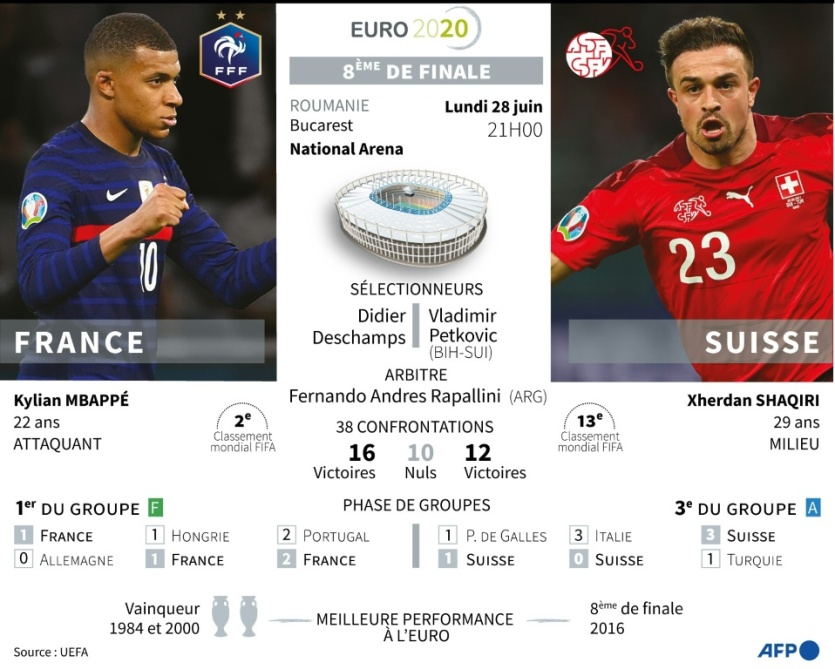 Les Helvètes, emmenés par le gardien expérimenté Yann Sommer, le meneur de Liverpool Xherdan Shaqiri et l'attaquant de Mönchengladbach Breel Embolo, ont disposé de huit jours de repos depuis leur dernier match, trois de plus que les Français.