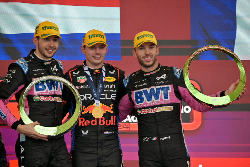 Les choses ont été totalement maîtrisées puisque le trio de tête, qui ne s’était jusqu’à présent pas arrêté pour changer ses pneus, a bénéficié d’un arrêt "gratuit" aux stands quelques tours plus tard, lorsque la course a été interrompue après la sortie de piste de l’Argentin Franco Colapinto (Williams). À la relance du GP, Ocon, très à l’aise sur piste mouillée, s’est rapidement défait de Verstappen… jusqu’à la sortie de piste de Carlos Sainz (Ferrari), nécessitant la neutralisation de la course et l’intervention de la voiture de sécurité. À la nouvelle relance, Verstappen a fait parler tout son talent sous la pluie pour reprendre les rennes du GP au Normand et entamer son envolée. Derrière, Ocon a solidement déroulé pour maintenir son rang devant Gasly, 13e sur la grille, qui a résisté jusqu’au bout à la Mercedes de George Russell, finalement quatrième.