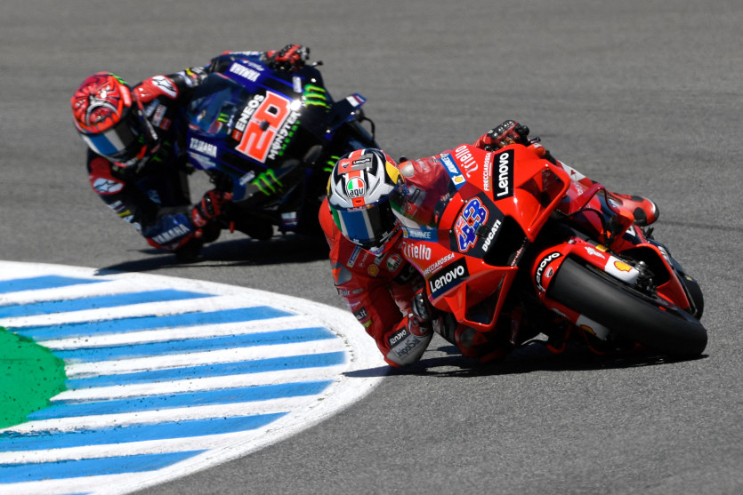 - L'Australien (26 ans) Jack Miller (Ducati, en rouge) a remporté dimanche soir son deuxième Grand Prix en MotoGP, à Jerez (Espagne), où le Français (22 ans) Fabio Quartararo (Yamaha, en noir) a perdu la tête du championnat en finissant 13e à cause d'un problème physique (importantesIl vous reste 57% de l'article à découvrir.Cet article est réservé aux abonnés.