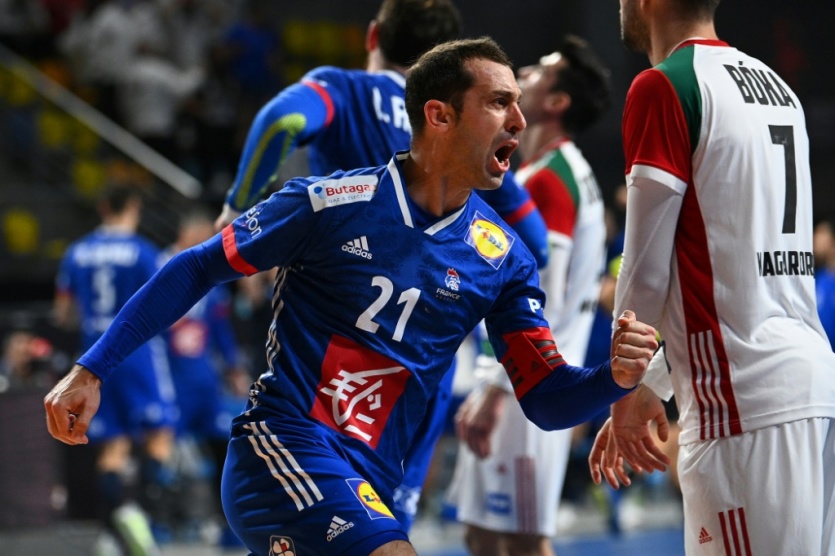 La joie de l'ailier et capitaine de l'équipe de France, Michael Guigou, après un but marqué contre la Hongrie, lors du quart de finale du Mondial de handball, le 27 janvier 2021 dans la Ville du 6 Octobre, un faubourg près du Caire Anne-Christine POUJOULAT [POOL/AFP]