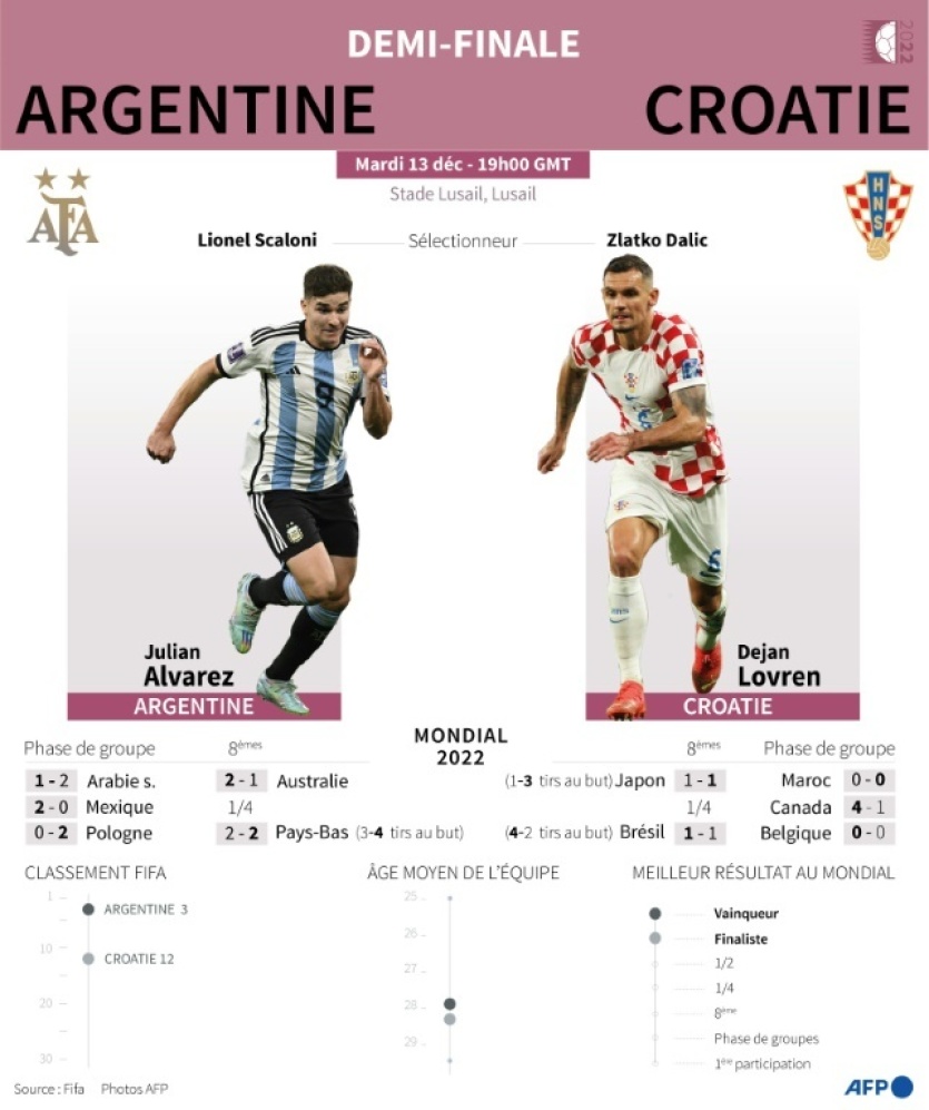 Et pour chacun des quatre demi-finalistes, l'histoire serait belle à écrire: la France de Mbappé peut devenir la première à conserver son titre depuis le Brésil de Pelé en 1962; l'Argentine aimerait tant consacrer Lionel Messi comme le digne héritier de Diego Maradona; et la Croatie, finaliste 2018, est un petit pays mais une grande nation de football...