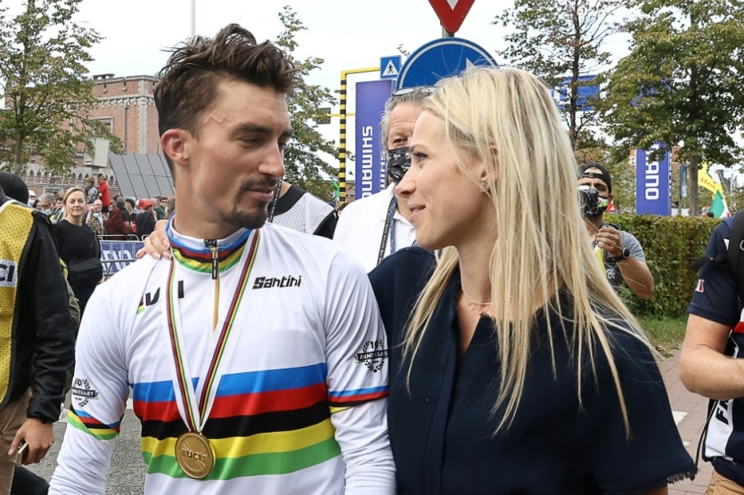 Julian Alaphilippe, champion du monde sur route pour la 2e année consécutive, et sa compagne Marion Rousse, après la cérémonie du podium, le 26 septembre 2021 à Louvain Kenzo Tribouillard [AFP]