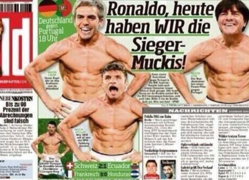 - Au lendemain de la large victoire de l'Allemagne face au Portugal en Coupe du monde (4-0), Bild ne se gêne pas pour chambrer copieusement Cristiano Ronaldo. Le quotidien allemand fait sa Une avec un montage de Joachim Löw, Philipp Lahm et Thomas Muller prenant la même pose que la star du RealIl vous reste 17% de l'article à découvrir.Cet article est réservé aux abonnés.