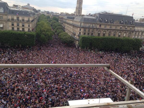 - Le parvis de l’Hôtel de Ville est bondé comme jamais, ce lundi pour le huitième de finale du Mondial, entre les Bleus et le Nigeria. C’est la première rencontre diffusée sur écran géant dans Paris, depuis le début de la Coupe du mondeIl vous reste 5% de l'article à découvrir.Cet article est réservé aux abonnés.