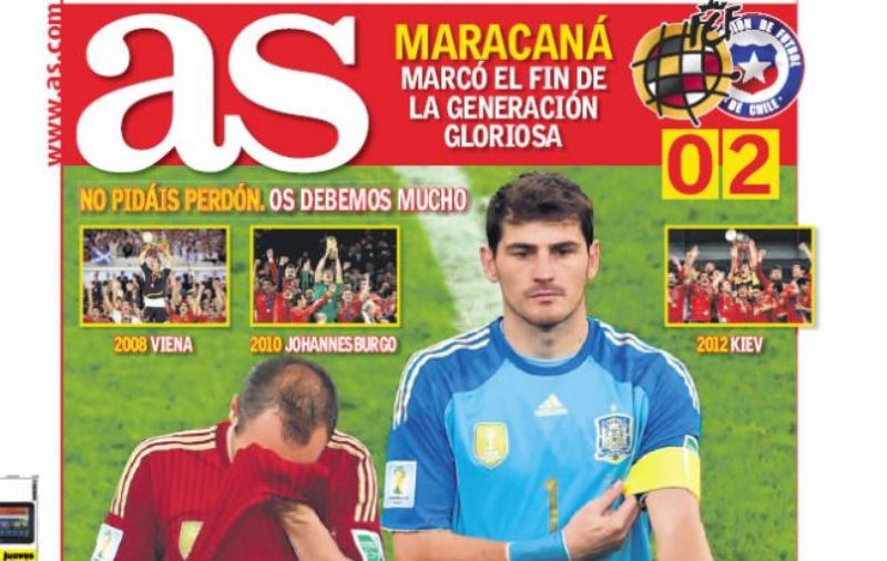 - L'élimination de l'Espagne au 1er tour de la Coupe du monde est évidemment à la Une de la presse du pays ce jeudi. Si la déception est grande, personne ne tire à boulets rouges sur ces immenses champions.La presse espagnole était en deuil mercredi soir après l’élimination de la Roja, dès son deuxième match du Mondial. « Etrillés » pouvait-on lire en Une du site Marca, qui mettait en scène la photo d’Iniesta, Xabi Alonso ou encore Diego Costa, tête basse, trainant desIl vous reste 87% de l'article à découvrir.Cet article est réservé aux abonnés.