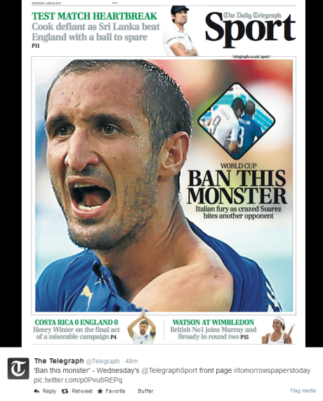 - Même s'il a ébloui la Premier League de sa classe cette saison, pas d'immunité pour l'attaquant uruguayen de Liverpool, Luis Suarez. Le Daily Telegraph a publié sa Une prévue pour mercredi. En titre : « Ban this monster », sous-entendu « Virez ce monstre ». Une référence à la morsureIl vous reste 25% de l'article à découvrir.Cet article est réservé aux abonnés.