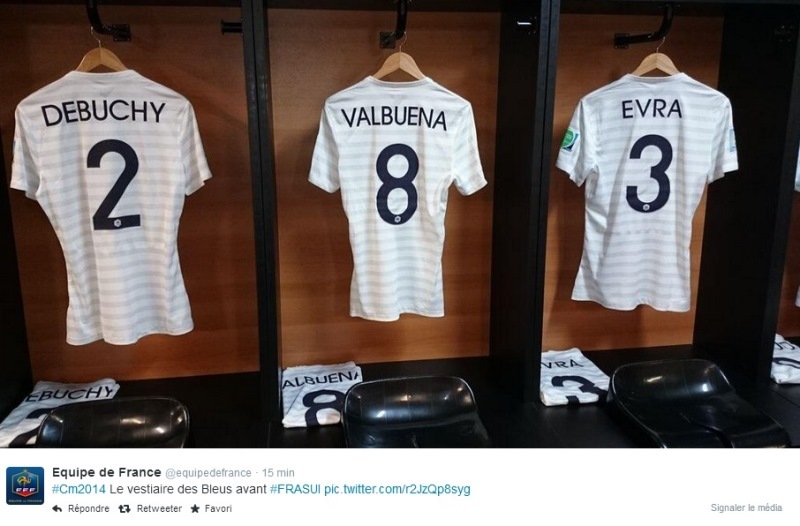 - L'équipe de France jouera en blanc ce vendredi soir face à la Suisse (21h), pour son deuxième match lors de la Coupe du monde 2014. C'est ce que confirme une photo du vestiaire des Bleus, qui a été publiée sur le compte Twitter de la sélection nationaleIl vous reste 5% de l'article à découvrir.Cet article est réservé aux abonnés.