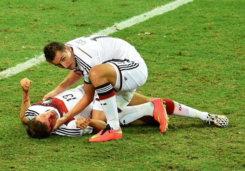 - C'est passé un peu inaperçu, mais Thomas Müller a terminé en sang la rencontre face au Ghana (2-2), ce samedi lors de la 2e journée du groupe G. Sur la dernière action, l'Allemand et le Ghanéen John Boye se sont violemment télescopés. Touché au visage, le Munichois a ainsi fini ensanglantIl vous reste 20% de l'article à découvrir.Cet article est réservé aux abonnés.