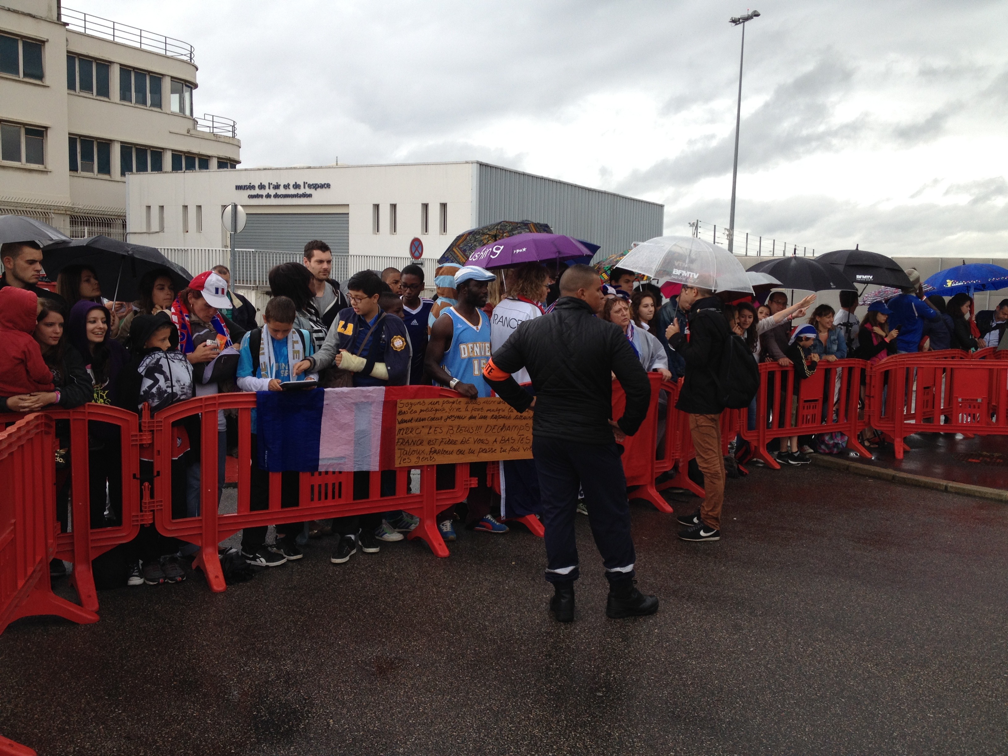 - À un peu moins d'une heure de l'arrivée de l'avion des Bleus à l'aéroport du Bourget, une petite centaine de supporters s'est rassemblée derrière les barrières pour accueillir l’équipe de Didier Deschamps.Certains attendent depuis plusieurs heures en scandant «Il vous reste 8% de l'article à découvrir.Cet article est réservé aux abonnés.