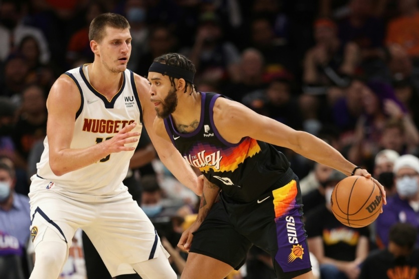 JaVale McGee, joueur des Phoenix Suns, tente de passer Nikola Jokic, des Denver Nuggets, en NBA le 20 octobre 2021 à Phoenix Christian Petersen [GETTY IMAGES NORTH AMERICA/AFP]MERCI DE VOUS IDENTIFIER